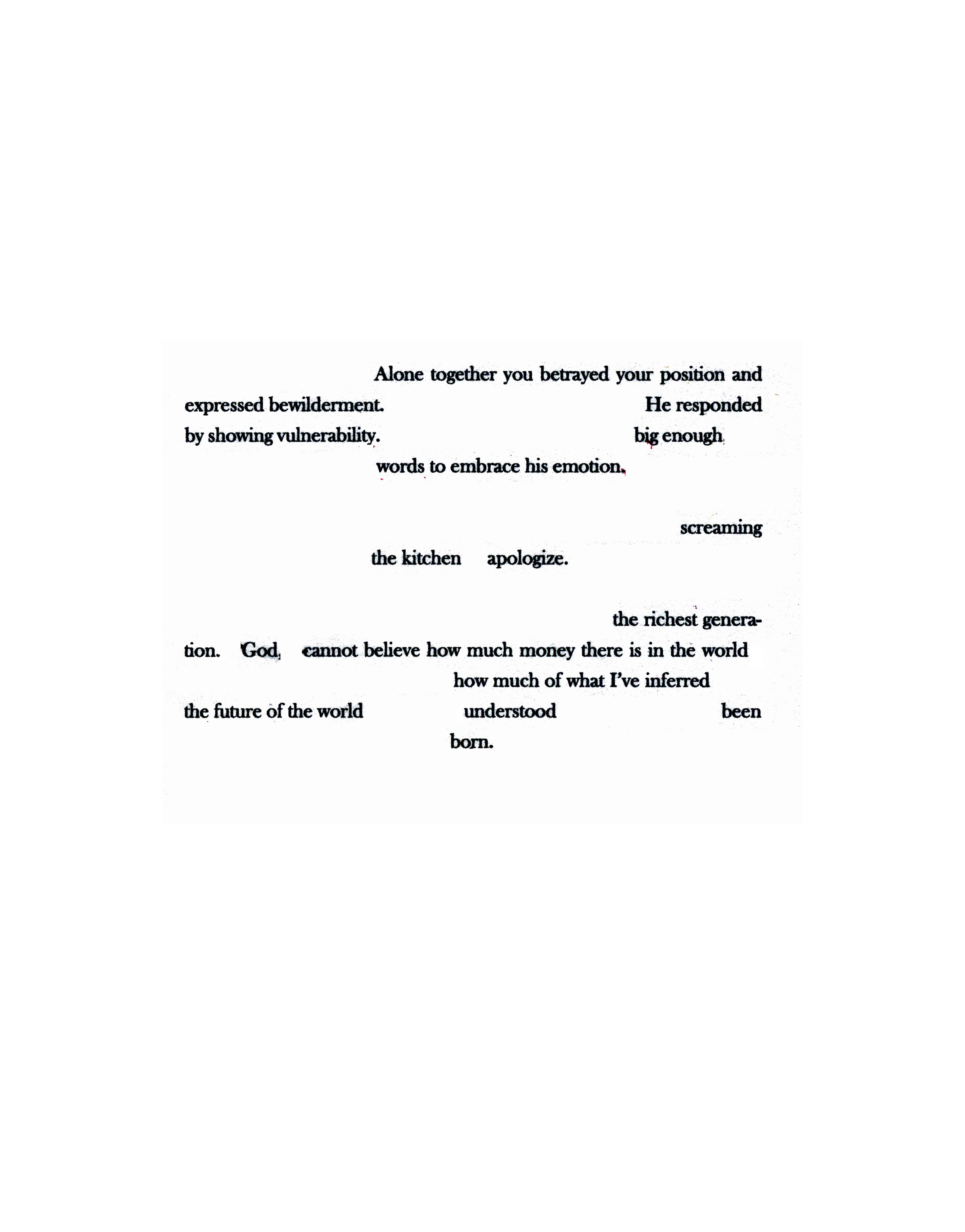 The text of the work is divided in two parts. The first is presented as 026_08_730 while the second is 026_08_731. The first part is an account from within from the perspective of a primary narrator who serves as the subject of the work. The second is an account from beyond the limits of where that narrator has been confined. While the first part reads as a desire to escape, understand the terms of confinement, and find the conditions for freedom, the second part reads as a report of what is happening within. Both have been redacted to remove “sensitive” information. This process of erasure on one hand is intended to affect a sense of history and depth to the work – giving each page value through the investment in removal. At the same time, the act is intended to destabilize the singular narrative either from within or without in order to lend each the capacity to describe a more universal condition and evoke a wider range of emotions in the reader through abstraction.